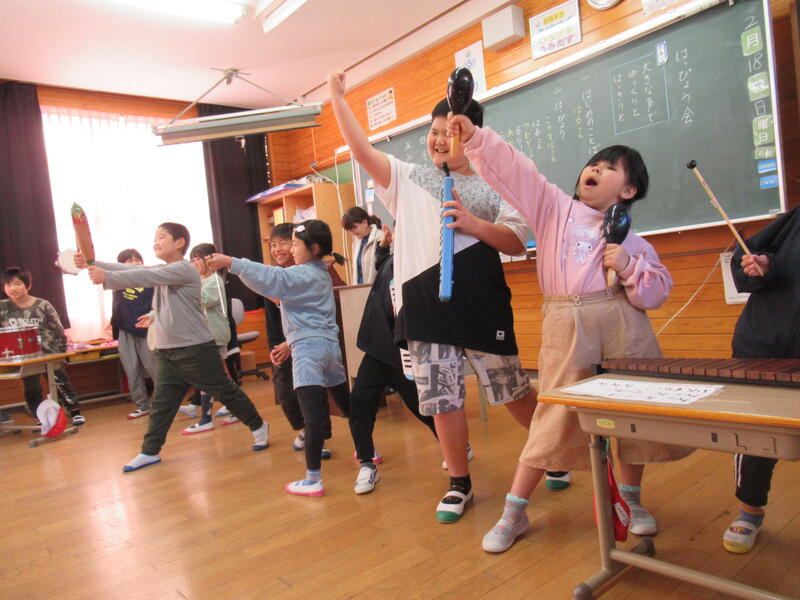 音楽の時間に木琴と鉄琴とすずとトライアングルを使って、音楽時計をつくりました。まず、グループで楽器の担当を話し合い、担当が決まったら各自で練習しました。その後、「この回は鉄琴は休み」「この回はみんなで演奏する」など組み合わせ方を話し合って、練習を重ねていきました。発表を録画して振り返ってみましたが、みんな違ってておもしろい音楽時計が出来上がっていました。