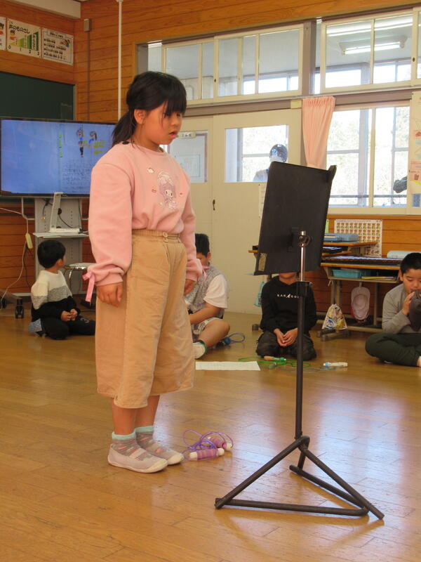 これまで音声をタブレットで何度も聞きながら音読練習をしてきました。本番では2人が声をそろえて叫ぶところも、息ぴったりでした。中には急に「ばばばあちゃん」役がアドリブを出してきて、動物たちが思わず笑ってしまうなど、楽しい発表もありました。