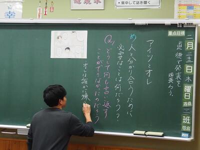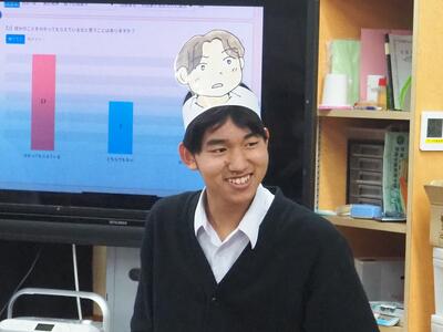 中学校3年生は道徳の授業もあとわずかになってきました。今週の中学3年生の道徳は、副担任の甲斐先生が授業をされました。「アイツとオレ」という題材で、「分かりあうために必要なことは何だろう。」というテーマで授業を進めていました。登場人物のお面を付けて実際に役になりきって意見を言うなど、甲斐先生ならではの工夫もあり、生徒達も楽しんで授業に参加していました。高校で新しい人間関係を作る上で大事なことを考えることができたと思います。