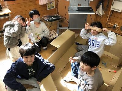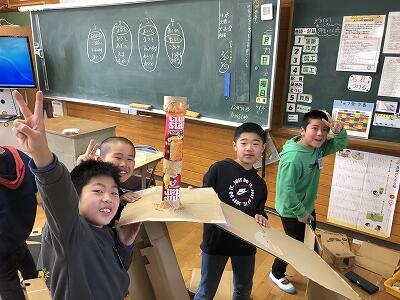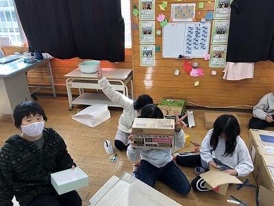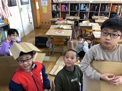 図画工作で「クミクミックス」の制作をしています。様々な大きさの段ボールを使い、グループで協力しながら作品を造りました。家や車、調理器具など日常生活に必要な物を造っていて、児童の表現の豊かさに驚かされました。友達と楽しそうに活動する姿を見て感激しました。どんな作品ができあがるか楽しみです!