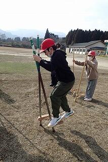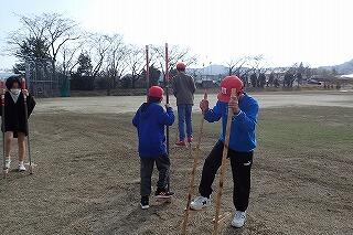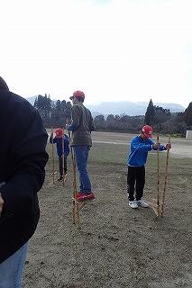 伝承遊びクラブでは、1年間の反省をした後、外で竹馬をしました