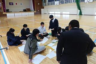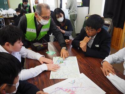 3月1日、防災士の方々とわけもん防災の大学生をお招きし、防災学習が行われました。前週の事前学習では、自宅付近の浸水想定範囲や土砂災害の想定範囲を確認しました。それを基に、今回は避難場所の確認や、そこまでの安全なルートを真剣に考えることができました。また、実際に災害が発生した場合を想定して、家族構成や家の車の台数、ペットの有無など自宅の状況を含め避難するまで流れをマイタイムラインとして作成し、安全な避難について考えました。