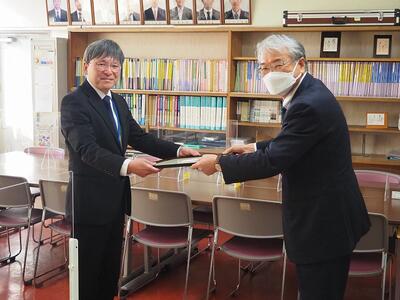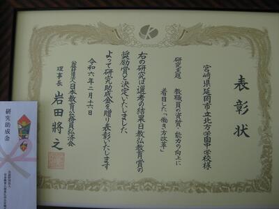 本日(3月8日)、公益財団法人日本教育公務員弘済会様から中学校の研究「教職員の資質・能力の向上に着目した『働き方改革』」に対して表彰がありました。宮崎支部の方が来校くださり、校長先生が代表として賞状と副賞(研究助成金)を受け取りました。今後も、賞にふさわしい実践を続けてまいります。誠にありがとうございました。