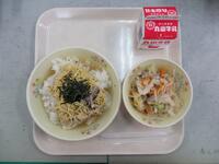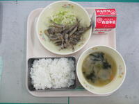 そして今日は海藻についてのお話です。健康な毎日を過ごしている人がよく食べているものを調べてみると、海藻をたくさん食べていることが分かりました。海藻に含まれるミネラルが血管を丈夫にし、血圧を下げてくれるからです。海藻の仲間には、のり・もずく・昆布・ひじきなどがあります。今日の給食のサラダの中には、わかめ、茎わかめ、赤かえでのりが入っています。