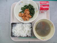 今日は小学5年生がリクエストした「ほうれん草のごま和え」です。小学5年生は家庭科の時間に、ほうれん草をゆでる調理実習をしました。ほうれん草は、沸騰したお湯の中に入れて茹でます。その後、水にとる冷却作業を行い、アクを除き、色よく仕上げます。今日のほうれん草のごま和えも一度沸騰したお湯に入れて茹でました。その後、冷却し味付けをしました。ほうれん草は生のときに比べ茹でると、分量が減るのでたくさん食べることができます。