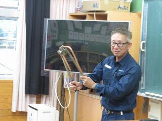 お仕事は、主に空調機器の販売や冷凍設備を行っているそうです。お話の後に仕事の体験として、子どもたちは実際に銅管を曲げる体験をしました。手で曲げるときれいに曲げられませんでしたが、専用の道具を使うときれいに曲げることができました。きれいに曲げたときは「おー。」という声が出ました。この道具は、理科の学習のてこの原理を使っているので、今学校で習っていることが将来につながることも学びました。足し算や引き算などの学習、相手に正確に伝えることなども将来につながることを聞いて、子どもたちは今頑張っている学習をできるようにしよう!と気持ちを高めていました。また、誰かのために貢献する、よりよいサービスを行おうという使命、ほこりをもって仕事を行うなど仕事に対する姿勢や気持ちについても熱心に語ってくださいました。