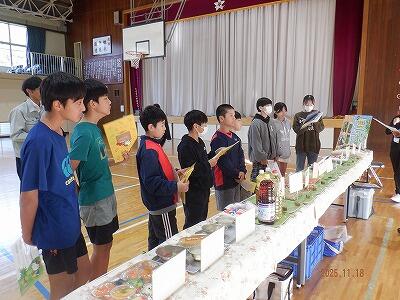 5時間目は、体育館で、「JA」「学校給食会」「県漁連」「本吉」の4つのブースに分かれて、野菜の事、給食の食材の事、魚の事、シイタケ栽培の事について話をお聞きしました。