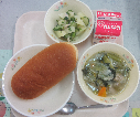 チーズパン、牛乳、ブイヤベース、コーンサラダ