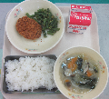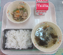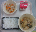 ごはん、牛乳、かんぱちの梅ソース和え、添え野菜、けんちん汁