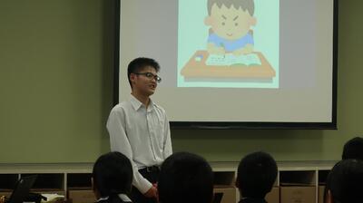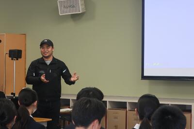 次に田口ファミリーパークの代表、田口正幸様による記念講演がありました。生徒たちは田口さんの話を熱心に聞き、メモをとっていました。