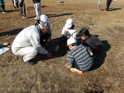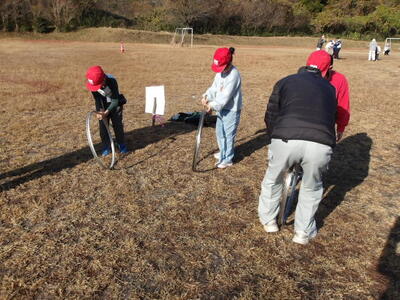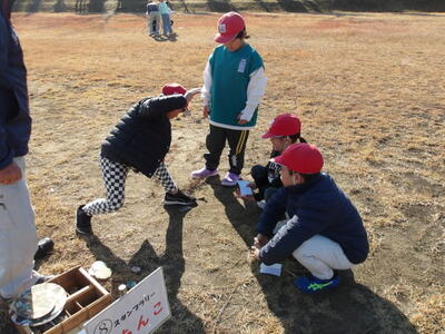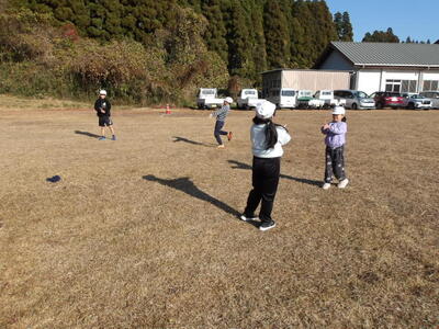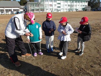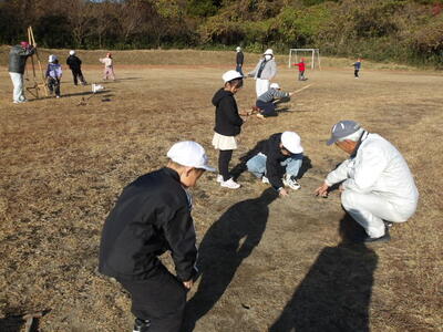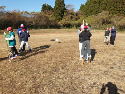 12月17日、1,2年生がむかしの遊びを体験しました。荒平会の方7名が来てくださり、「竹馬」「竹とんぼ」「ごま回し」「ぱちんこ」「リム回し」「ビー玉」を楽しんだ後、2チームに分かれて「たたきベース」もしました。難しくてうまくできないこともありましたが、日頃触れることの少ない遊びに子ども達は、時のたつのも忘れ夢中になっていました。