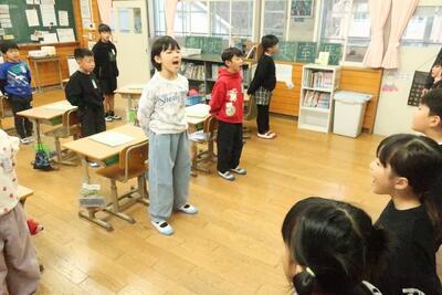 3学期に入り、どの学年も朝の時間を利用して、卒業式の歌の練習をしていますが、1、2年生は週に1回、合同で歌の練習をしています。一緒に練習することで口の開け方や声の出し方などお互いに刺激をもらい、練習のたびに上手になっています。お世話になっている6年生のために心を込めて練習しています。
