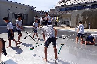 6月11日(火)13日(木)に小学5年生~中学3年生でプール清掃を行いました。ご覧のとおりプールがとてもきれいになり、今すぐにでも泳ぎたくなりますね。写真は中学3年生の様子です。