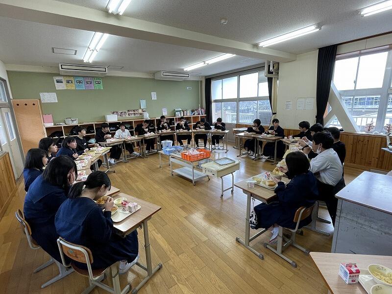 また、本日は中学生活最後の給食で、みんなで輪になって顔を見合わせながら、給食を美味しく味わいました。
