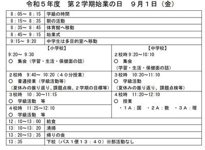 夏休みは楽しく過ごすことができたでしょうか。いよいよ明日9月1日(金)から2学期が始まります。日程は下の通りです。児童生徒の皆さんと元気に笑顔で再会できることを楽しみにしています。