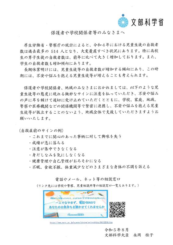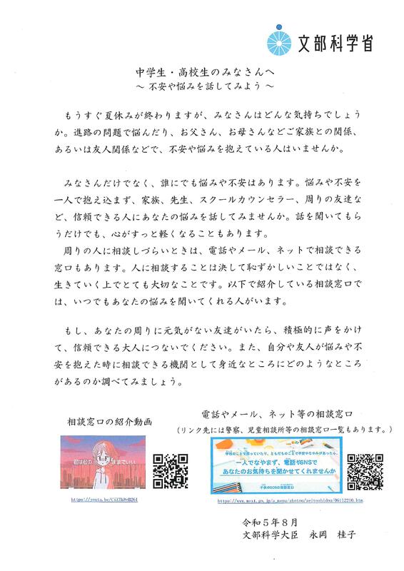 もうすぐ夏休みが終わります。小学生、中学生、保護者のみなさんへ、文部科学大臣からメッセージが届いています。ぜひ、ご一読ください。保護者宛て文書からもご覧いただけます。