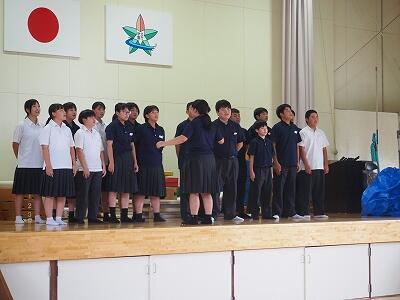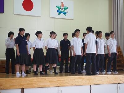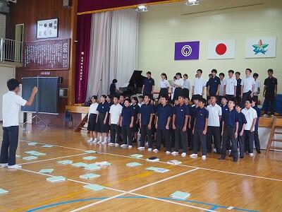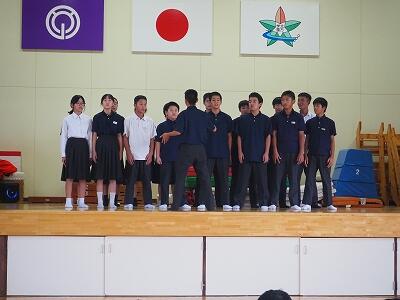 10月6日(日)に中学校の清流祭(文化祭)が開催されます。写真は合同音楽での様子です。入退場のリハーサルも兼ねて学年合唱の発表を行い、最後に全校合唱をしました。生徒たちは総合的な学習の時間や音楽の授業、昼休みなどを使って準備をしています。本番まであと少し、応援よろしくお願いします。
