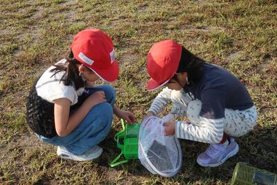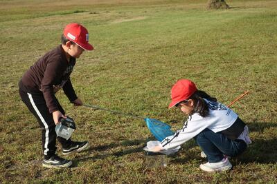 バッタが跳んでいるのをみつけて、夢中で追いかけていく1年生。