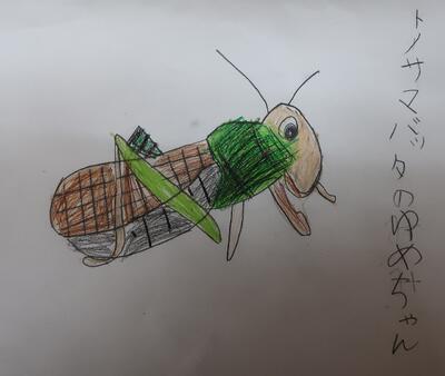 運動場には大きなバッタがたくさんいて、大興奮でした。