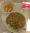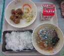 ごはん、牛乳、かきたま汁、大豆とかえりの揚げ煮
