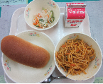 コッペパン、牛乳、高菜ビーフン、カラフルサラダ