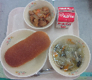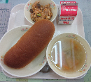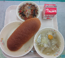 コッペパン、牛乳、五目スープ、鶏肉とカシューナッツの揚げ煮