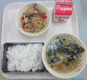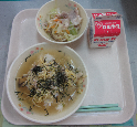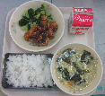 鶏飯、牛乳、豚肉と野菜の和風ソース和え