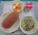減量コッペパン、牛乳、冷やし中華、フルーツ杏仁