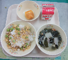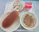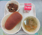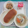 コッペパン、牛乳、ラビオリスープ、鶏肉と大豆のトマト煮