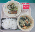 ごはん、牛乳、かんぱちの梅ソース和え、添え野菜、みぞれ汁