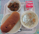 黒糖パン、牛乳、鶏肉と大豆のトマト煮、ふわふわスープ
