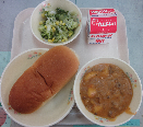 コッペパン、牛乳、チリコンカン、アーモンドサラダ、ベビーチーズ