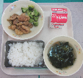 ごはん、牛乳、鶏肉のレモン和え、ゆでブロッコリー、野菜スープ