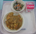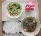 ごはん、牛乳、鶏肉とカシューナッツの揚げ煮、五目スープ