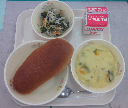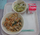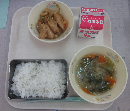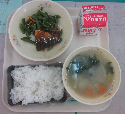 ごはん、牛乳、鶏肉とカシューナッツの揚げ煮、五目スープ