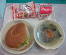照り焼きチキンバーガー、牛乳、カラフルスープ、クリスマスデザート