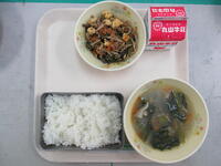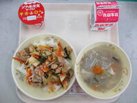 今日の給食では、カルシウムをとるように飛鳥汁の中に、牛乳と青菜の小松菜を入れました。