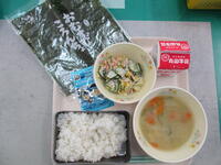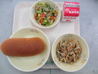 みなさんの中にもハンバーガーが好きな人は多いと思います。ファストフードのお店で食べるとき、ハンバーガーと一緒に頼むサイドメニューはどんなものを選んでいますか?いつもフライドポテトを頼む人は、サラダにしたり、ドリンクを炭酸飲料ではなく、お茶や牛乳、野菜ジュースにしたりすると、ビタミンや無機質を補うことができます。今日の給食では野菜がたくさん入ったふわふわスープとヨーグルトを組み合わせました。