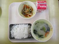 今日の給食は小学6年生が考えたリクエスト献立の小松菜のみそ汁です。小学校の家庭科で学習した五大栄養素をふまえた栄養バランスに加え、北方や延岡、宮崎県の食材を入れること、3月の季節や体調面を考えることなど、さまざまな視点をもとに献立を完成させました。献立を考える授業では、から揚げとの組合せとして、小松菜のみそ汁の具を考えたのですが、牛丼との組合せでも合うということで今日の献立に取り入れました。このグループのこだわりは、県内の特産品をたくさん使って五大栄養素をバランスよく組合せたことです。詳しくは、事務室前の食育掲示物に掲示しています。