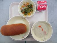 コッペパン 牛乳 カラフルスープ 魚のマヨソース焼き ひなあられ