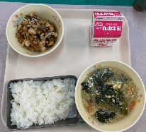 ごはん、牛乳、大豆とかえりの揚げ煮、かきたま汁