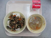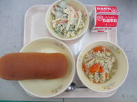 今日から新しい学年での給食が始まりました。みなさん、一つずつ学年があがり給食の量も少しずつふえます。これはみなさんの体が成長するために必要な量です。給食は、栄養バランスのとれた食事でみなさんの健やかな成長を支え、望ましい食習慣と食に関する実践力を身に付けるための役割があります。しっかり食べて元気な体で新しい学年をスタートさせましょう。