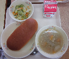 コッペパン、牛乳、カラフルスープ、トマトソースハンバーグ