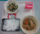 ごはん、はいがふりかけ、牛乳、筑前煮、酢みそ和え