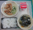 ごはん、牛乳、地頭鶏のから揚げ、きゅうりの昆布和え、すまし汁