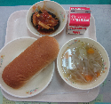 コッペパン、牛乳、キャベツのスープ、トマトソースハンバーグ
