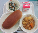 黒糖パン、牛乳、ポークビーンズ、アーモンドサラダ
