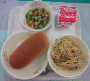減量コッペパン、牛乳、和風きのこスパゲティ、コーンサラダ