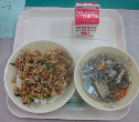 チーズパン、牛乳、ブイヤベース、大豆とささみのサラダ