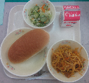 減量コッペパン、牛乳、ひむかナポリタン、ごまじゃこサラダ